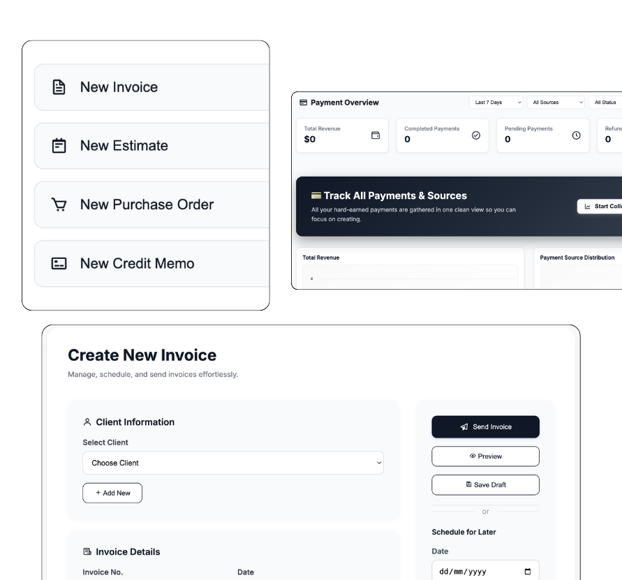 Get paid on time. Create and send professional invoices in seconds. Track your revenue and automate payment reminders.