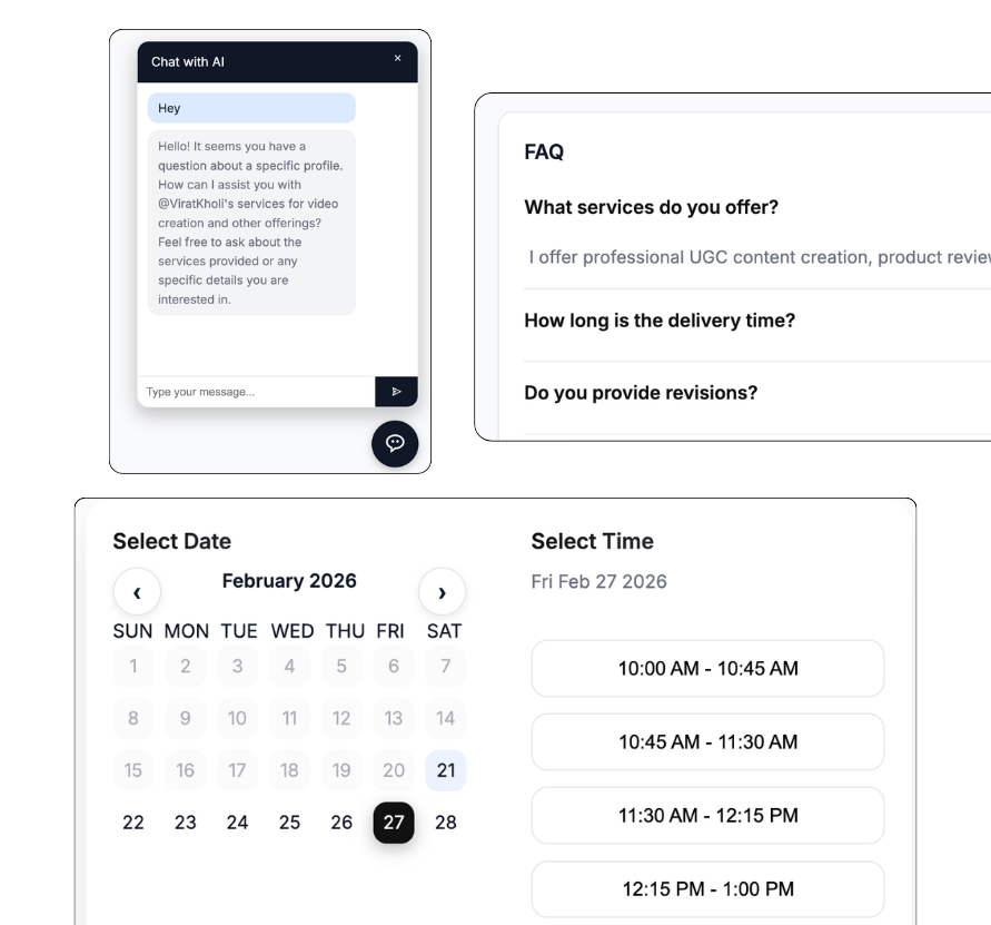 - 1-on-1 Bookings: If a brand is serious, they can book a slot on your calendar instantly.
