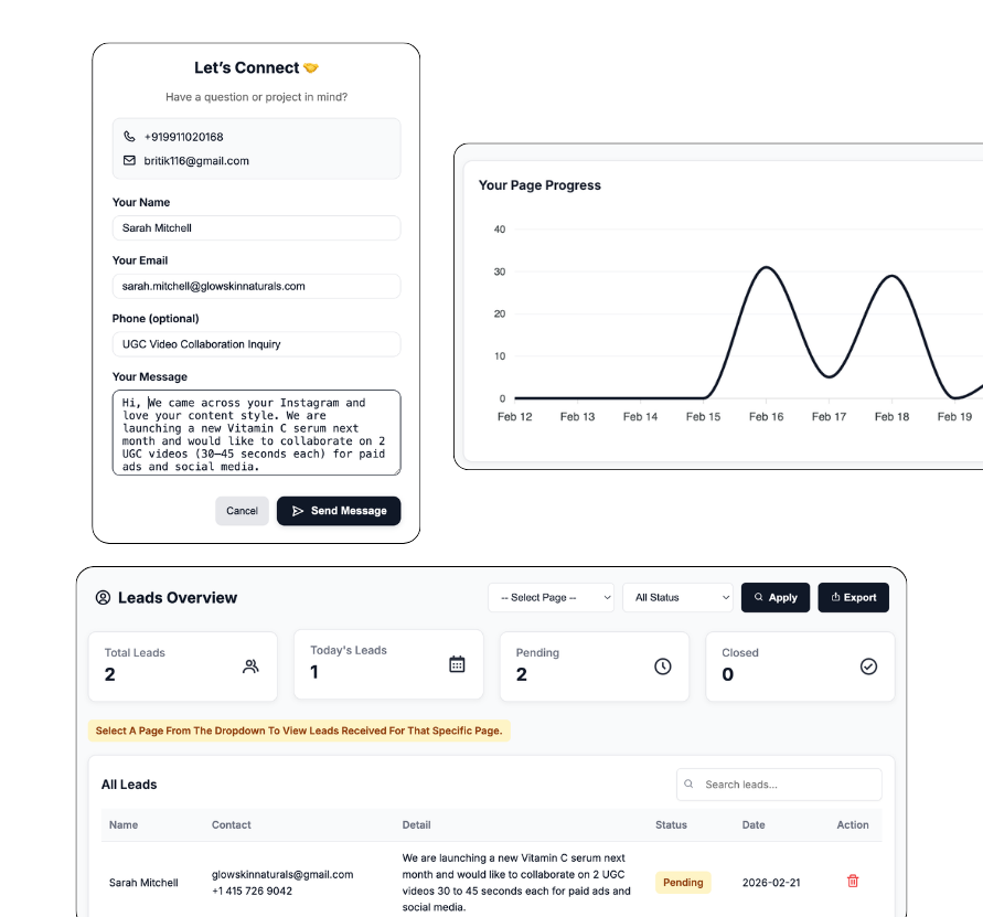 Stop losing business to the DM abyss. Your content acts like an ad that drives traffic to your page. Instead of hoping brands email you, give them a high-converting Lead Collector form. Every inquiry is stored in your dashboard so you can follow up days or weeks later.